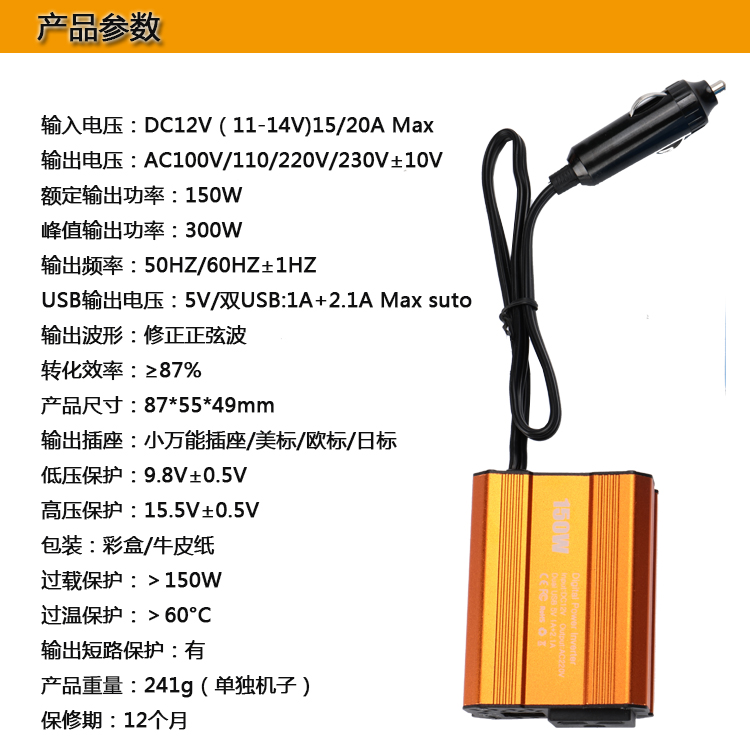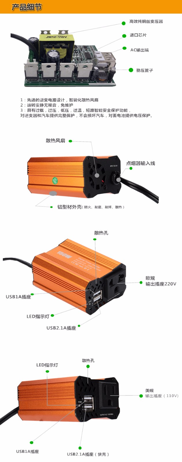 150W車載逆變器是專門為汽車設(shè)計(jì)的一款逆變器。通過車載點(diǎn)煙器把汽車上的直流電12V轉(zhuǎn)換為110V/220V交流電供手機(jī),平板,筆記本電腦使用。
